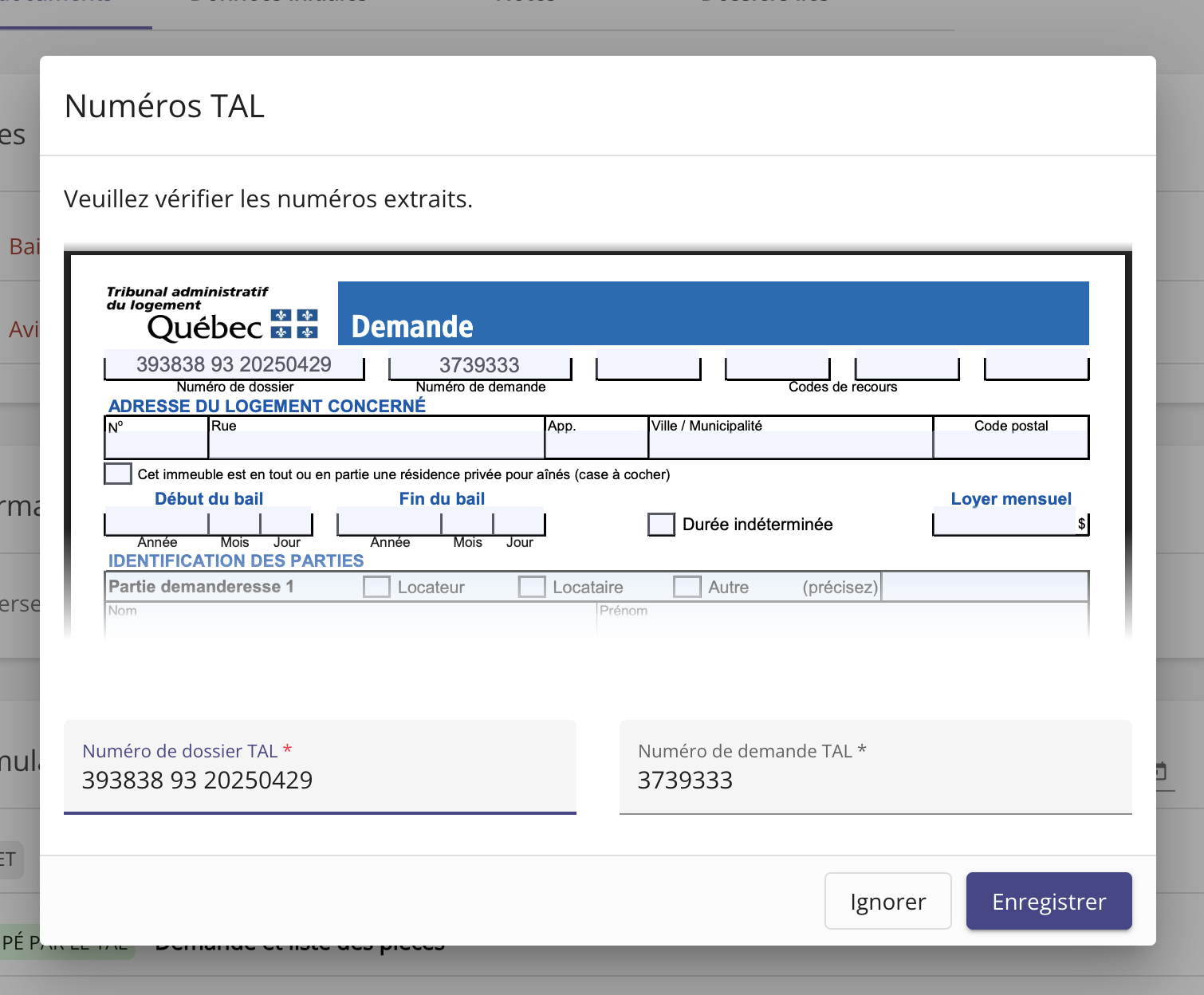 À la suite du téléversement de la demande étampée, les numéros du TAL sont extraits par reconnaissance optique des caractères (OCR: Optical Character Recognition), et une fenêtre de dialogue permet de les vérifier.