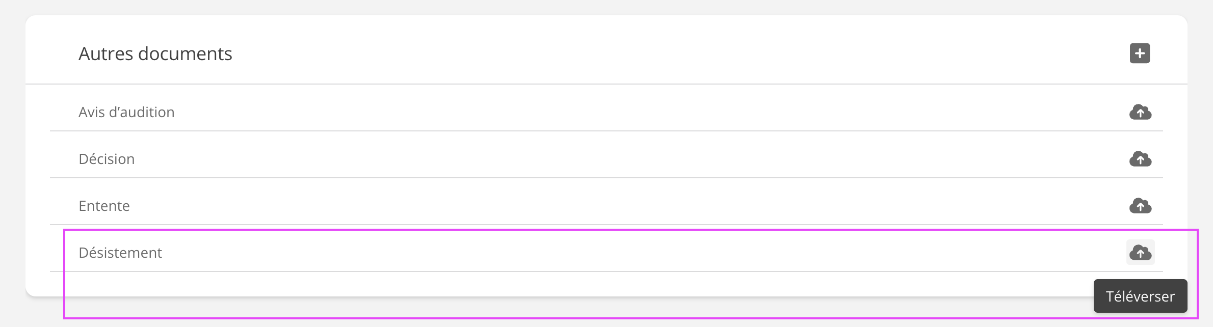 Dans Oprio, dans la page du dossier, téléverser le formulaire rempli dans dans la ligne intitulée Désistement, ce qui changera le statut du dossier à Désistement.