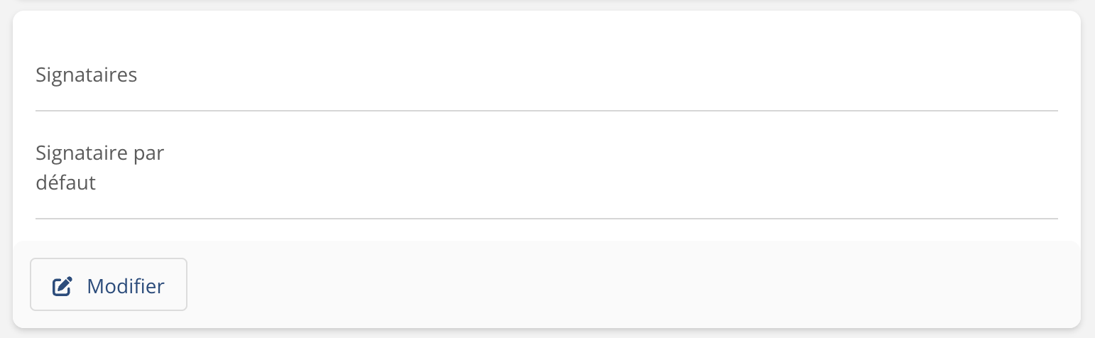Dans le champ Signataire par défaut, on coche celui qui, parmi les Signataires autorisés, sera assigné par défaut à tous les documents qui requièrent une signature. Il est à noter qu’il pourra être remplacé au niveau d’un document.