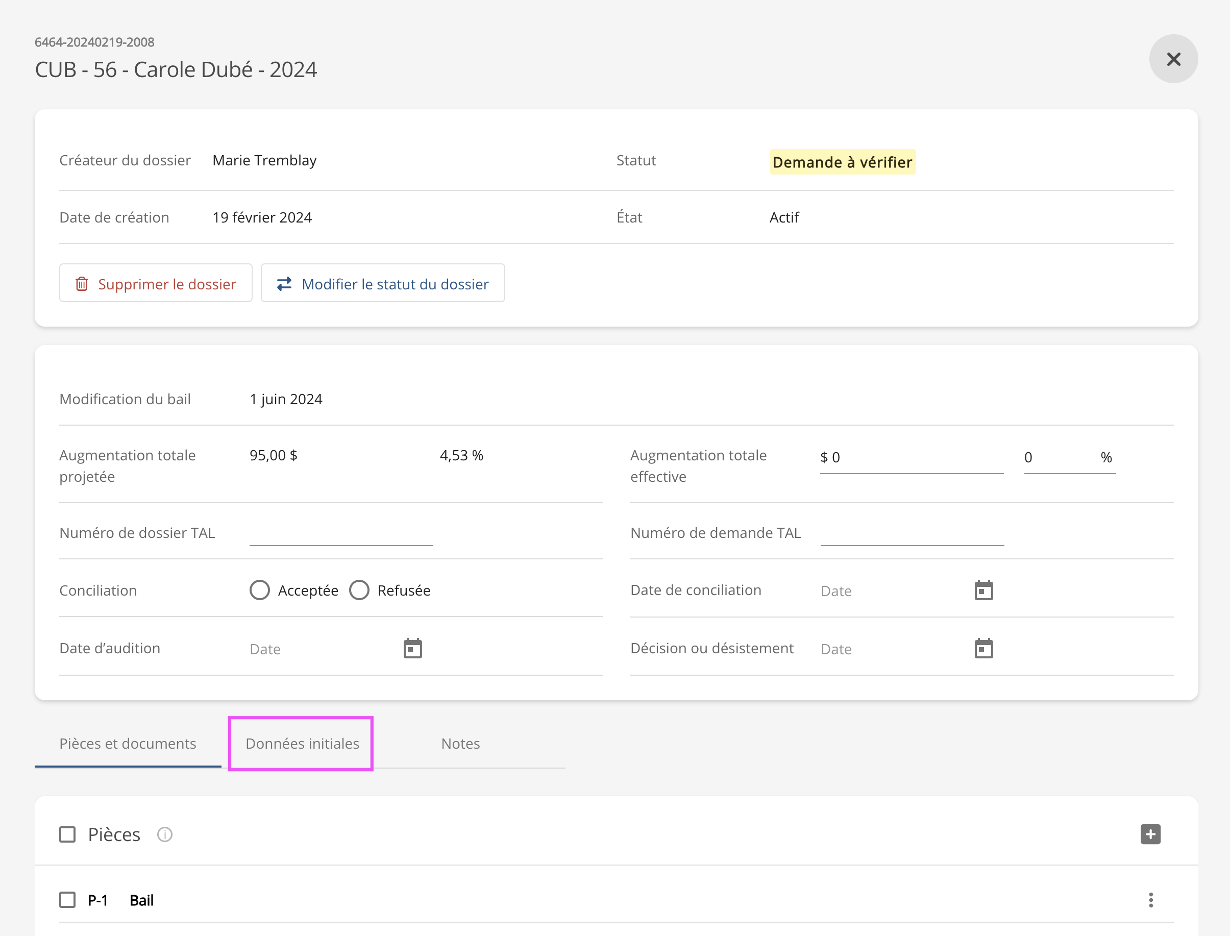 Cliquer sur l’onglet Données initiales pour voir les informations entrées lors de la création du dossier.