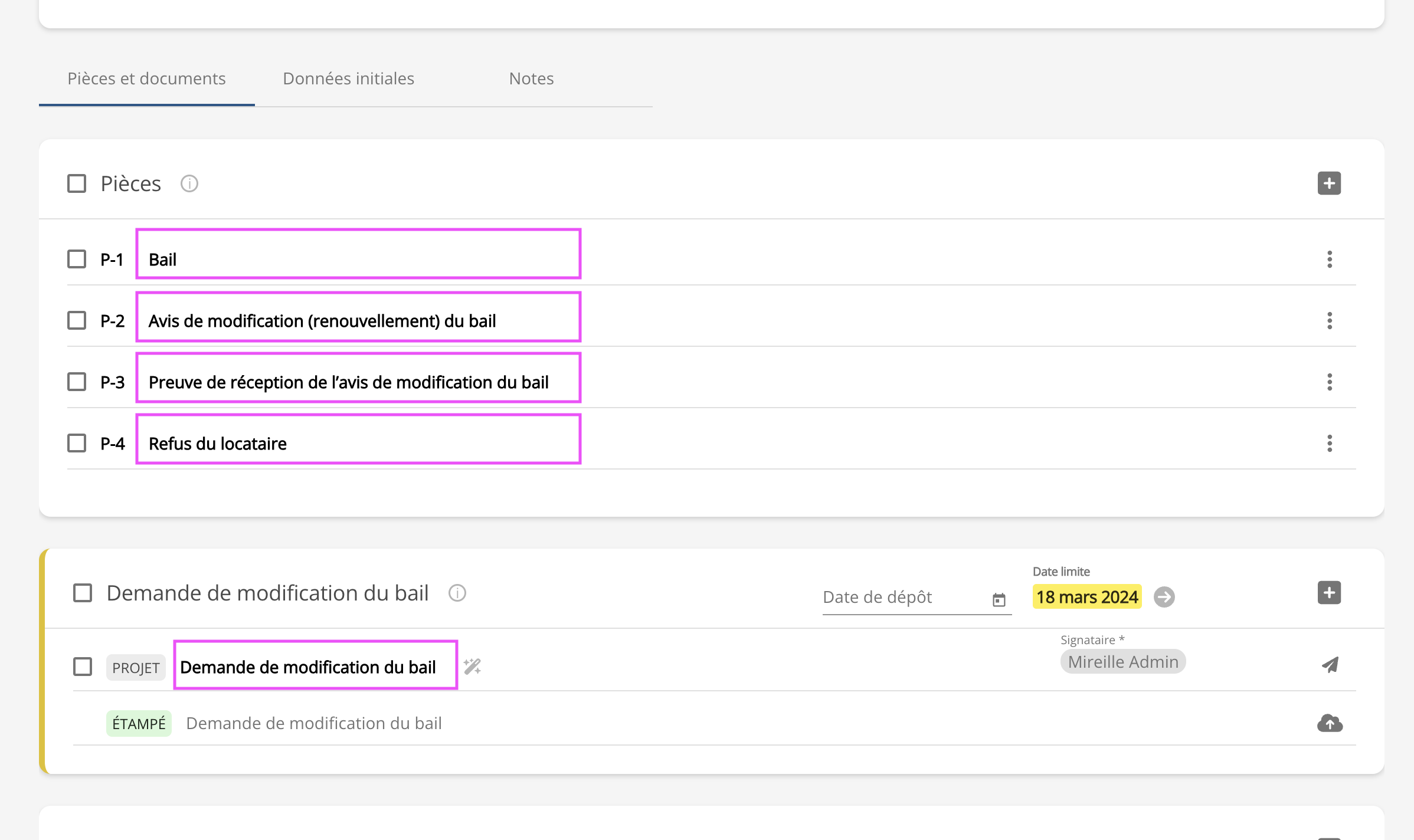 Dans l’onglet Pièces et documents, cliquer sur une pièce ou sur la Demande de modification du bail, ce qui ouvrira le document dans un autre onglet. On peut ainsi s’y référer au fil de la vérification.