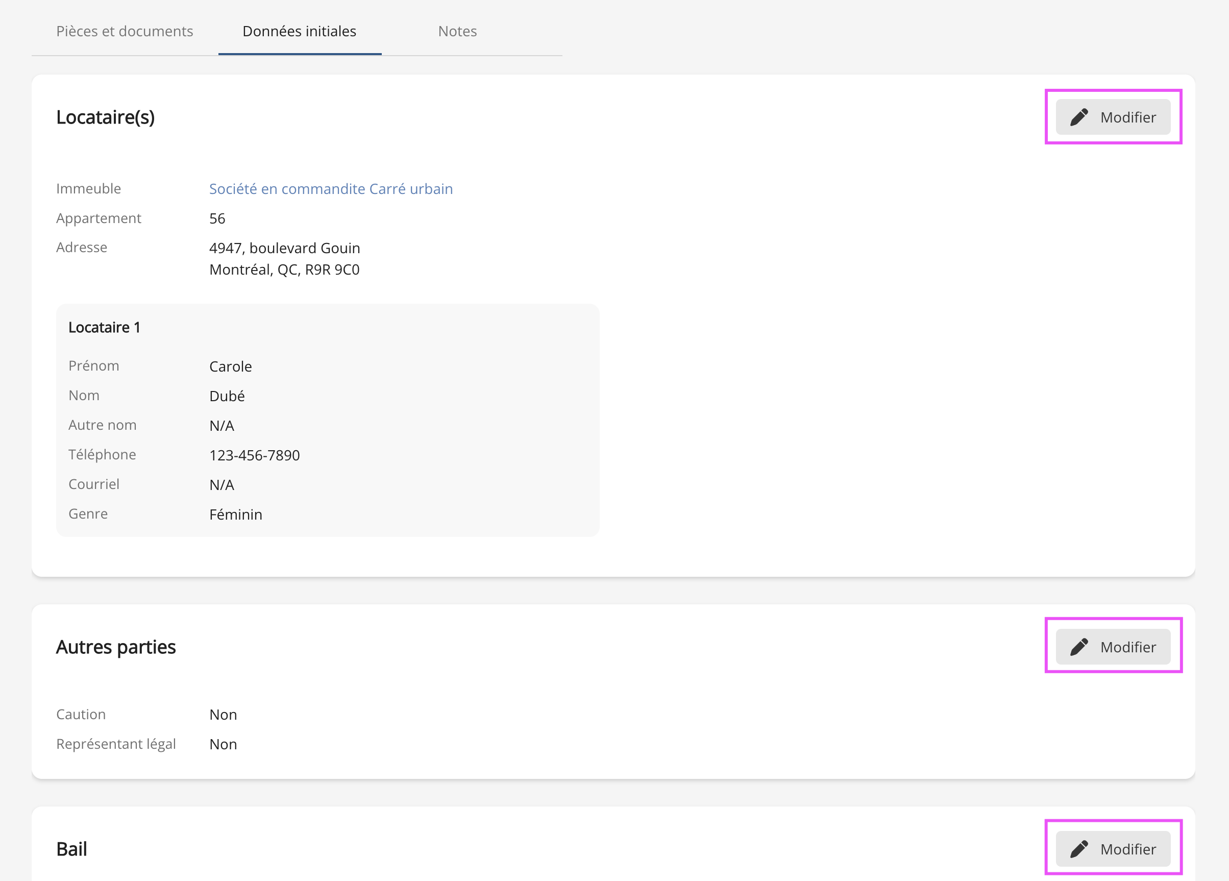 [Optionnel] Pour apporter des corrections, cliquer sur le bouton Modifier de la section concernée. Les changements, si y a lieu, seront appliqués à la demande de modification de bail.