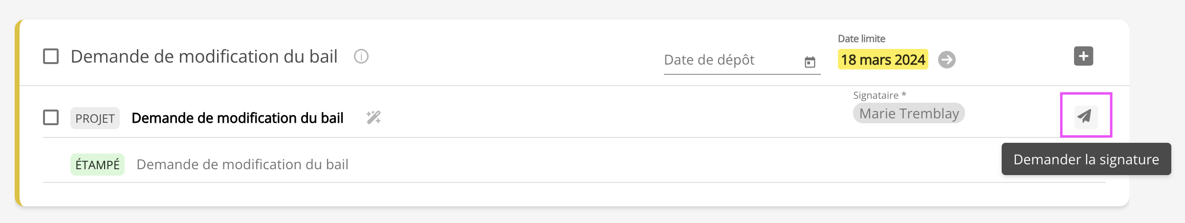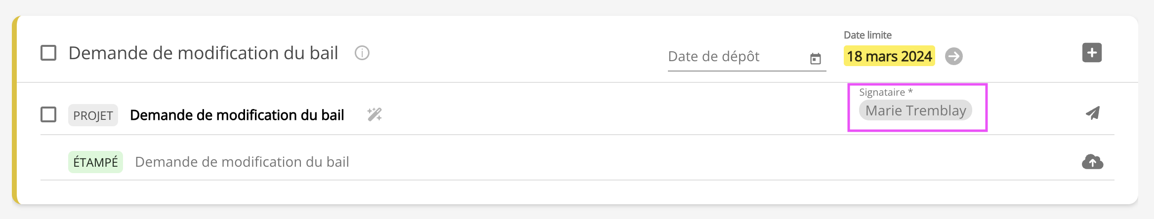 L’utilisateur qui est signataire par défaut apparait dans la ligne de la Demande de modification du bail.