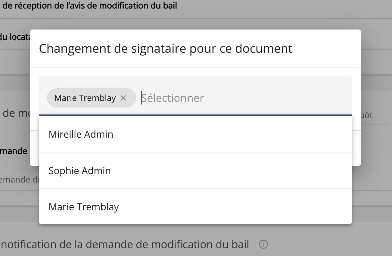 [Optionnel] Pour modifier le signataire d’un document, cliquer le nom du signataire dans la ligne du document en question. Les utilisateurs qui apparaissent dans le menu déroulant sont les signataires autorisés.
