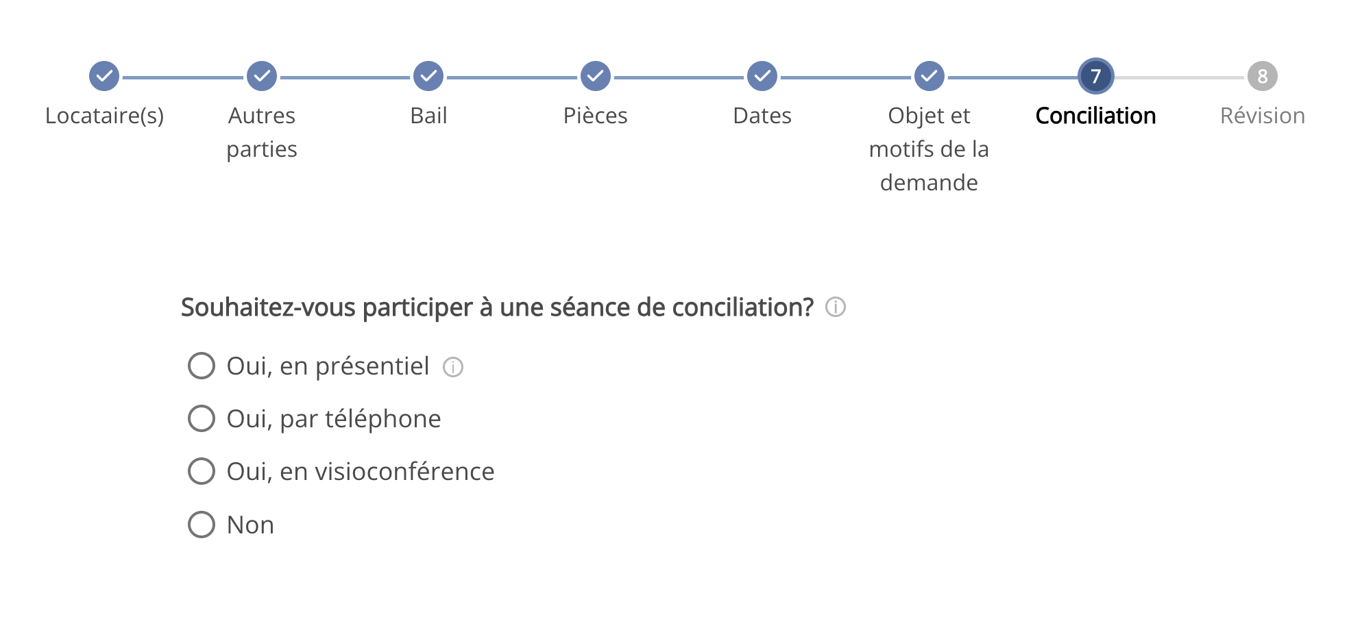 Lors de la création d’un nouveau dossier, une étape sur la conciliation a été ajoutée. Celle-ci correspond à la nouvelle section des formulaires de demande du TAL.