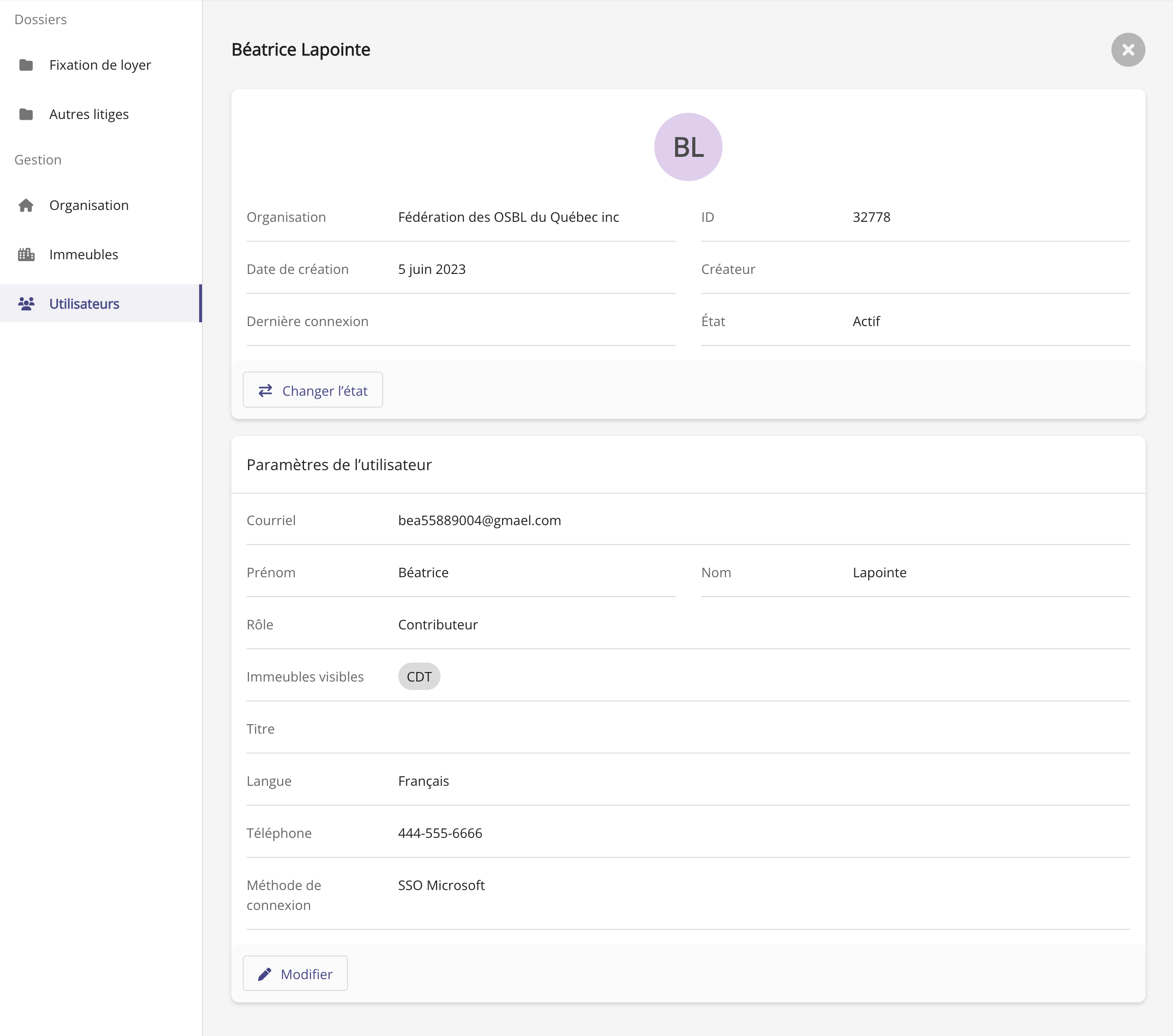 La page de gestion d’un utilisateur a été restructurée. Notamment, il est désormais requis de définir les immeubles visibles lors de la création d’un nouvel utilisateur dont le rôle est Éditeur ou Contributeur.