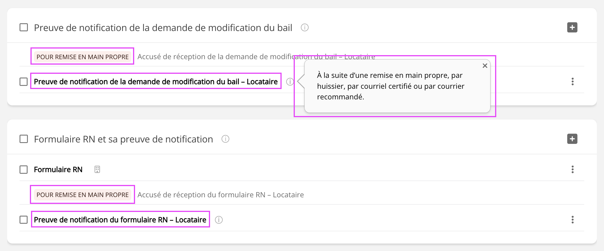Certains libellés des pages de dossier ont été modifiés pour plus de clarté lorsque le locataire est notifié par un autre moyen qu’en main propre : par huissier, par courriel certifié ou par courrier recommandé.