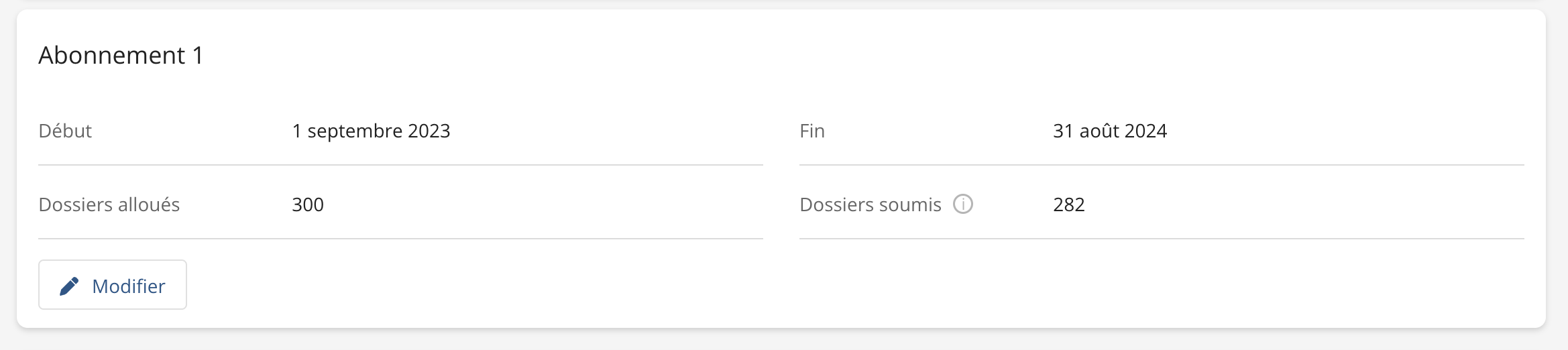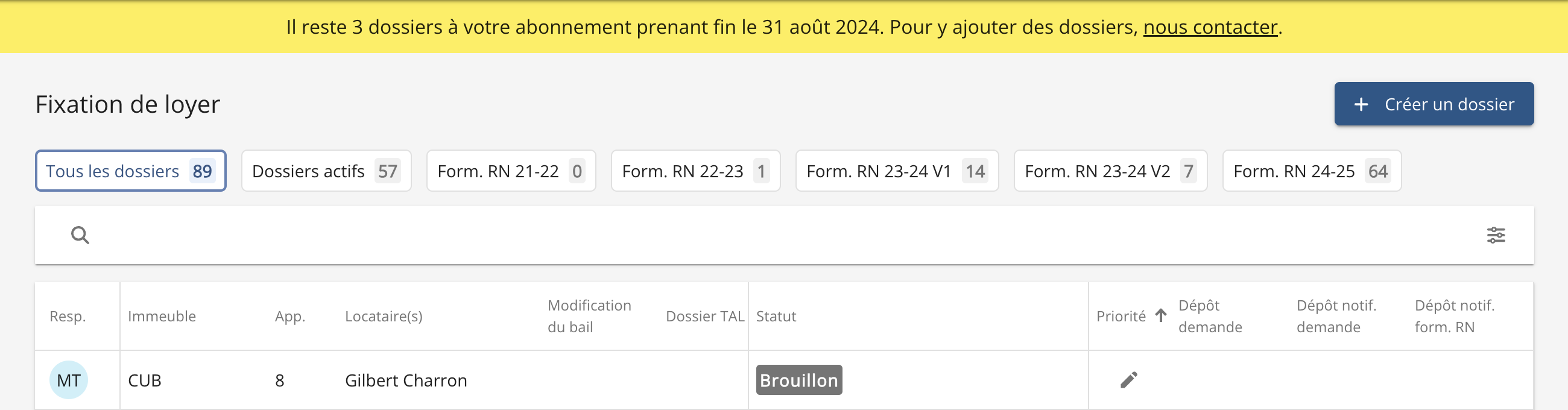 À partir du moment où il reste 5 dossiers ou moins disponibles dans un forfait (le nombre de dossiers alloués moins le nombre de dossiers soumis), une bannière jaune est affichée en haut de la page.