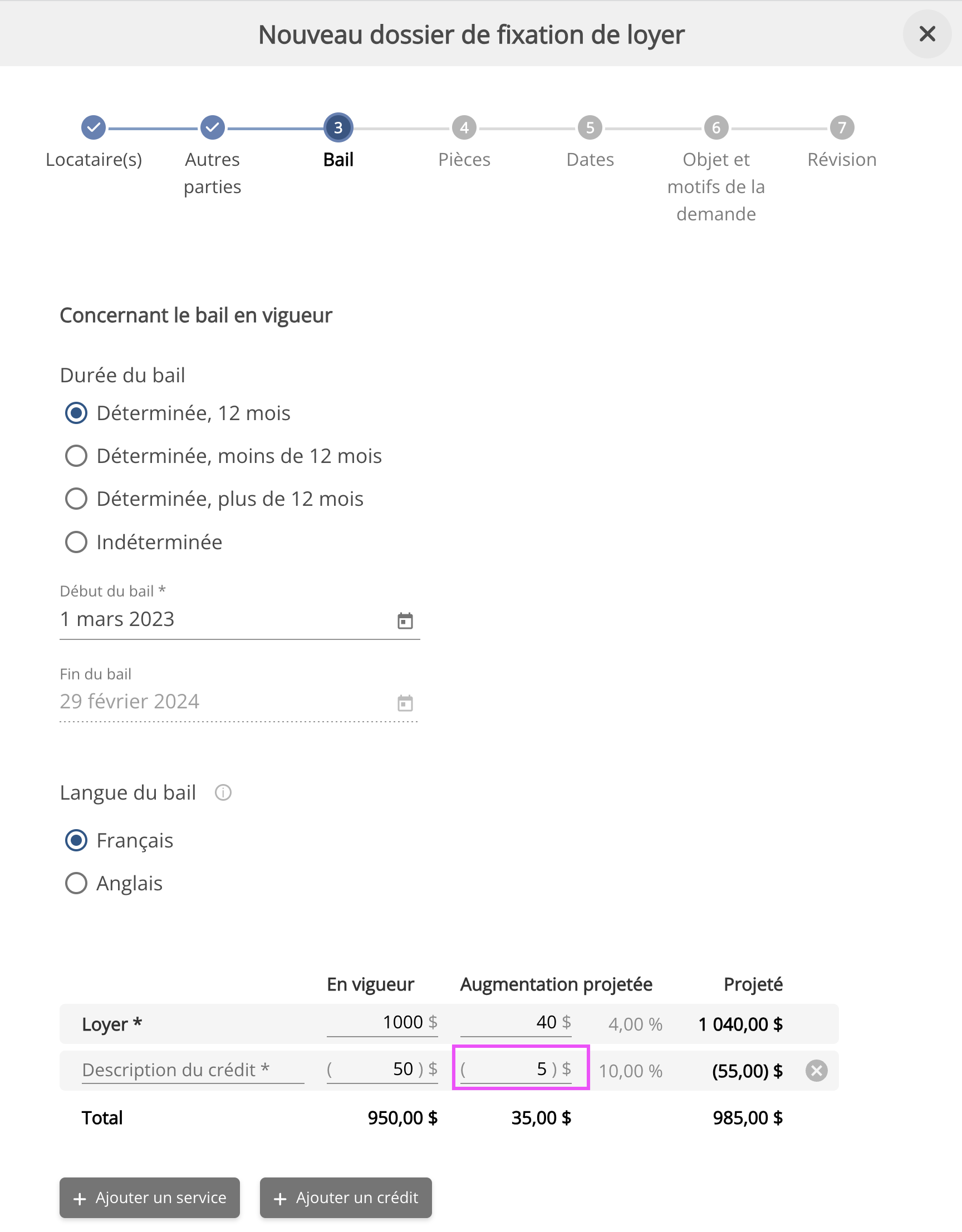 Lorsqu’un crédit est ajouté au montant du loyer, le montant entré dans la colonne Augmentation projetée est désormais négatif.