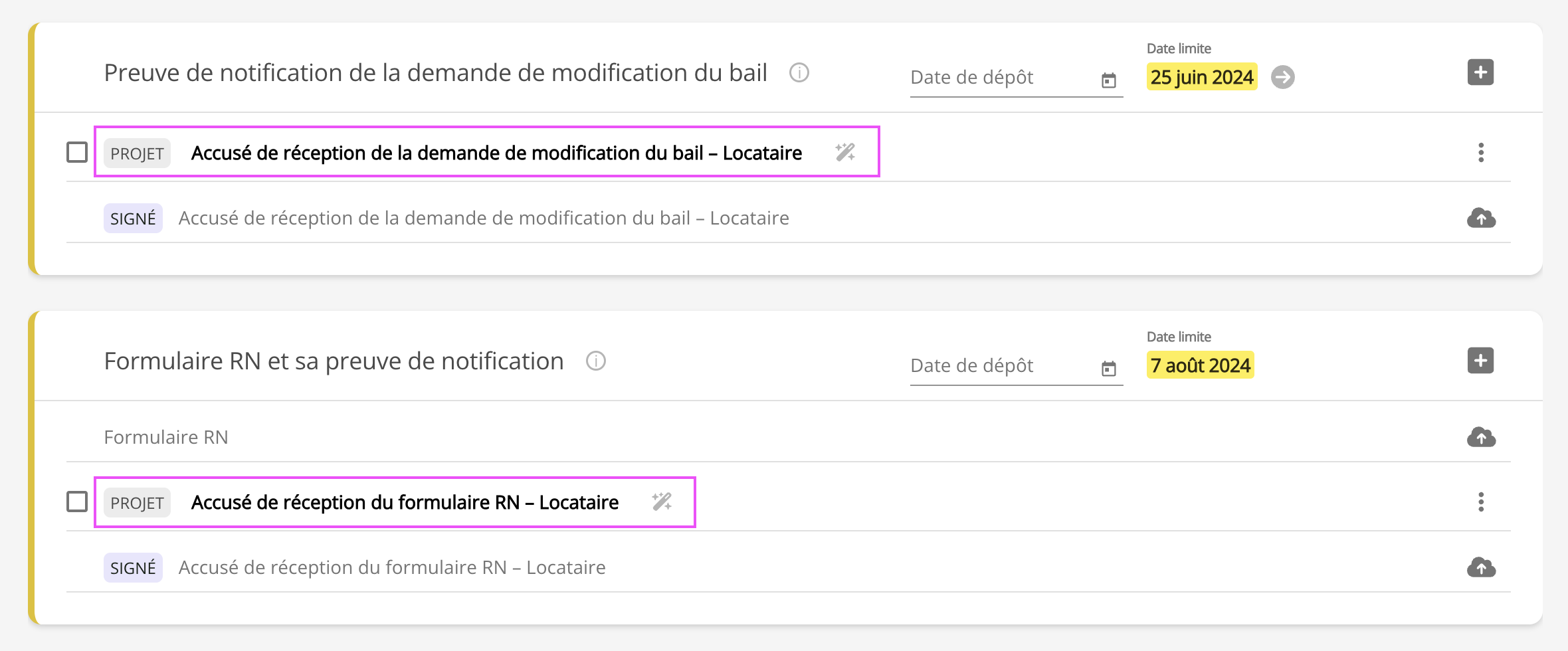 Pour les dossiers de fixation de loyer, des accusés de réception sont désormais générés par le logiciel. Il s’agit de ces deux documents dans la page d’un dossier:
