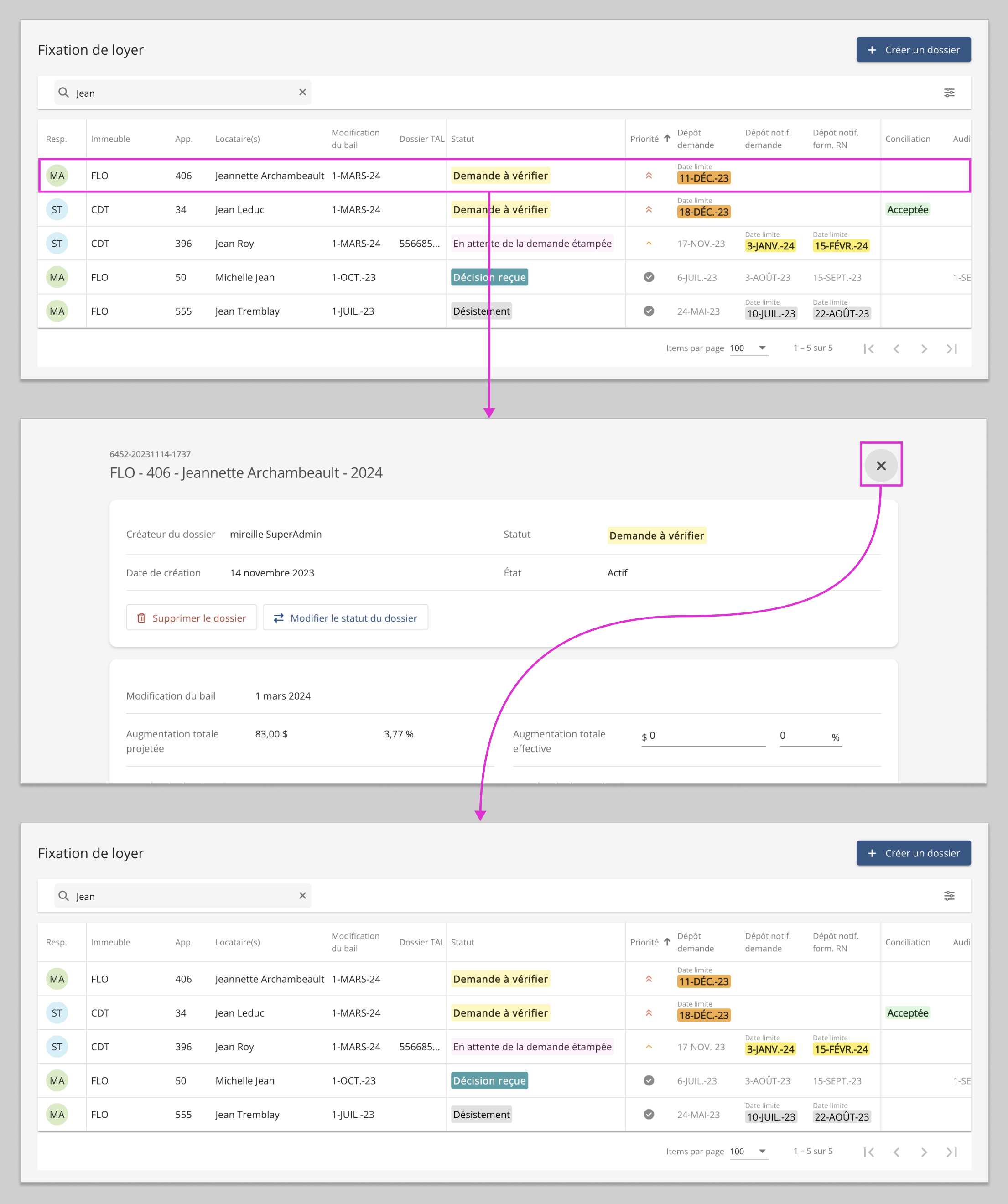 Dans toute liste d'éléments, lorsque des filtres sont appliqués, incluant une recherche par mot, après avoir cliqué pour consulter l’un des éléments et fermé celui-ci, les filtres sont toujours appliqués.