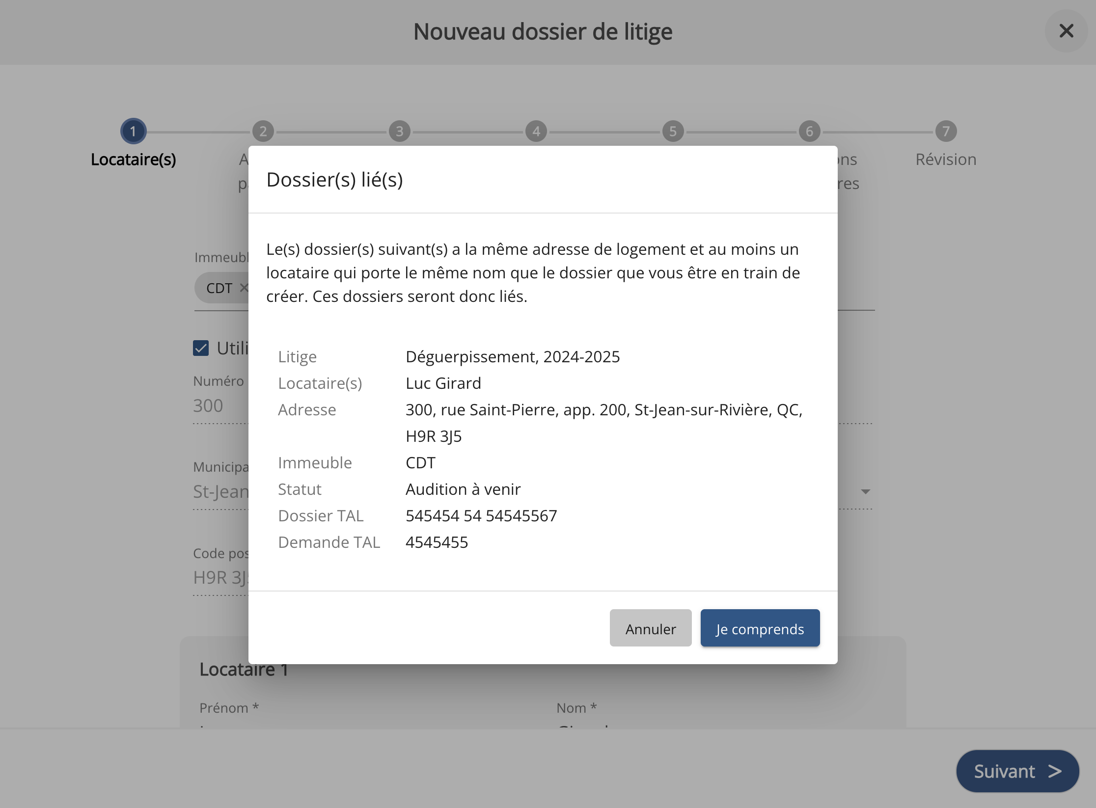 Dès la création d’un dossier, à l'étape Locataire(s), le système détecte si un dossier existant a :