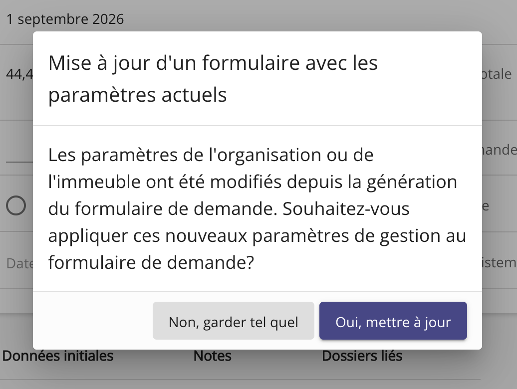 Si un formulaire de demande au TAL contient des informations provenant de l’organisation ou de l’immeuble, et que celles-ci sont modifiées après la génération du formulaire (mais avant la signature), il est maintenant possible d’effectuer une mise à jour du formulaire.