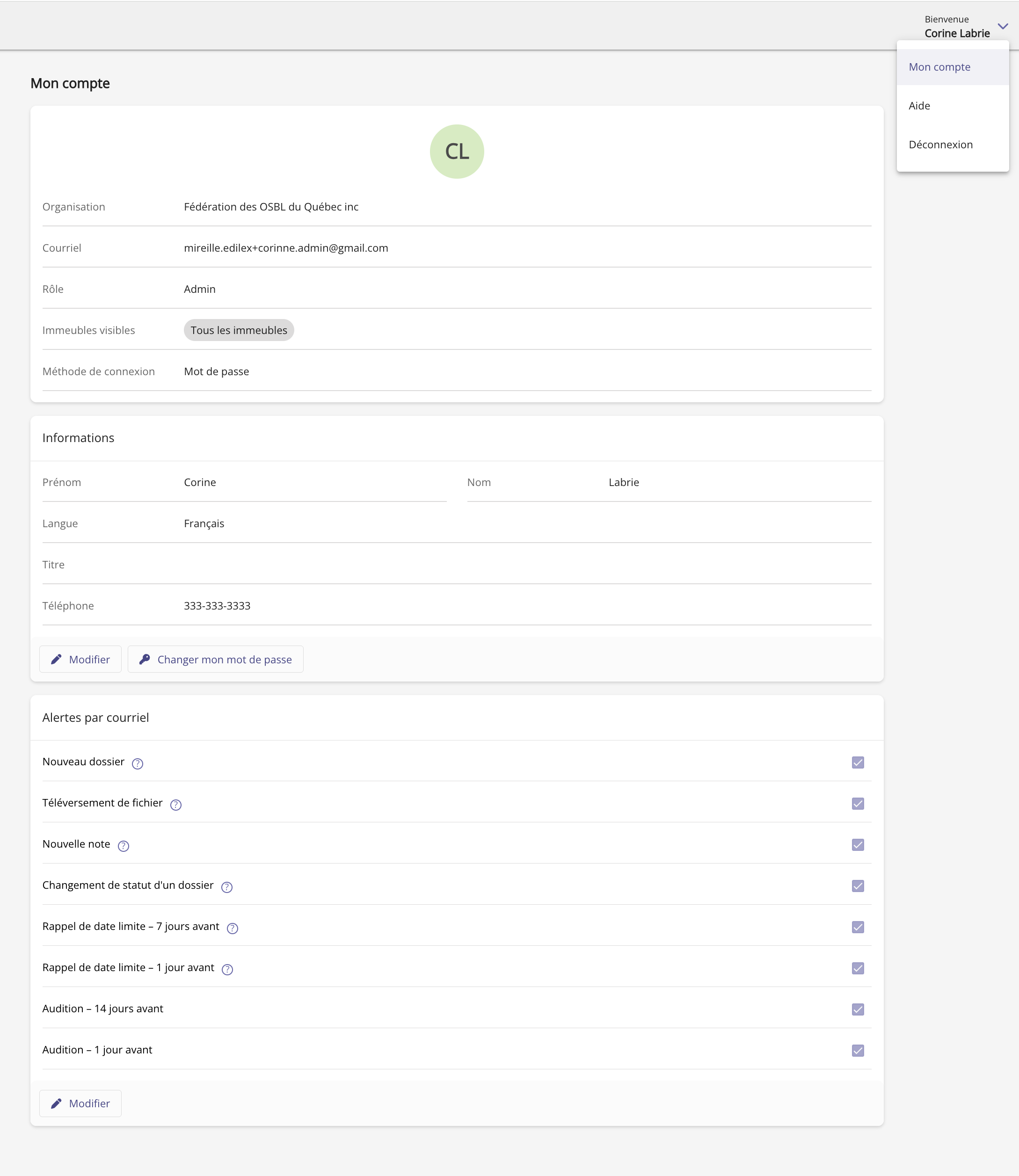 La page Mon compte, accessible à partir du bouton de bienvenue en haut à droite, a été uniformisée par rapport aux autres pages de l’application. Aussi, elle contient des informations additionnelles, dont:
