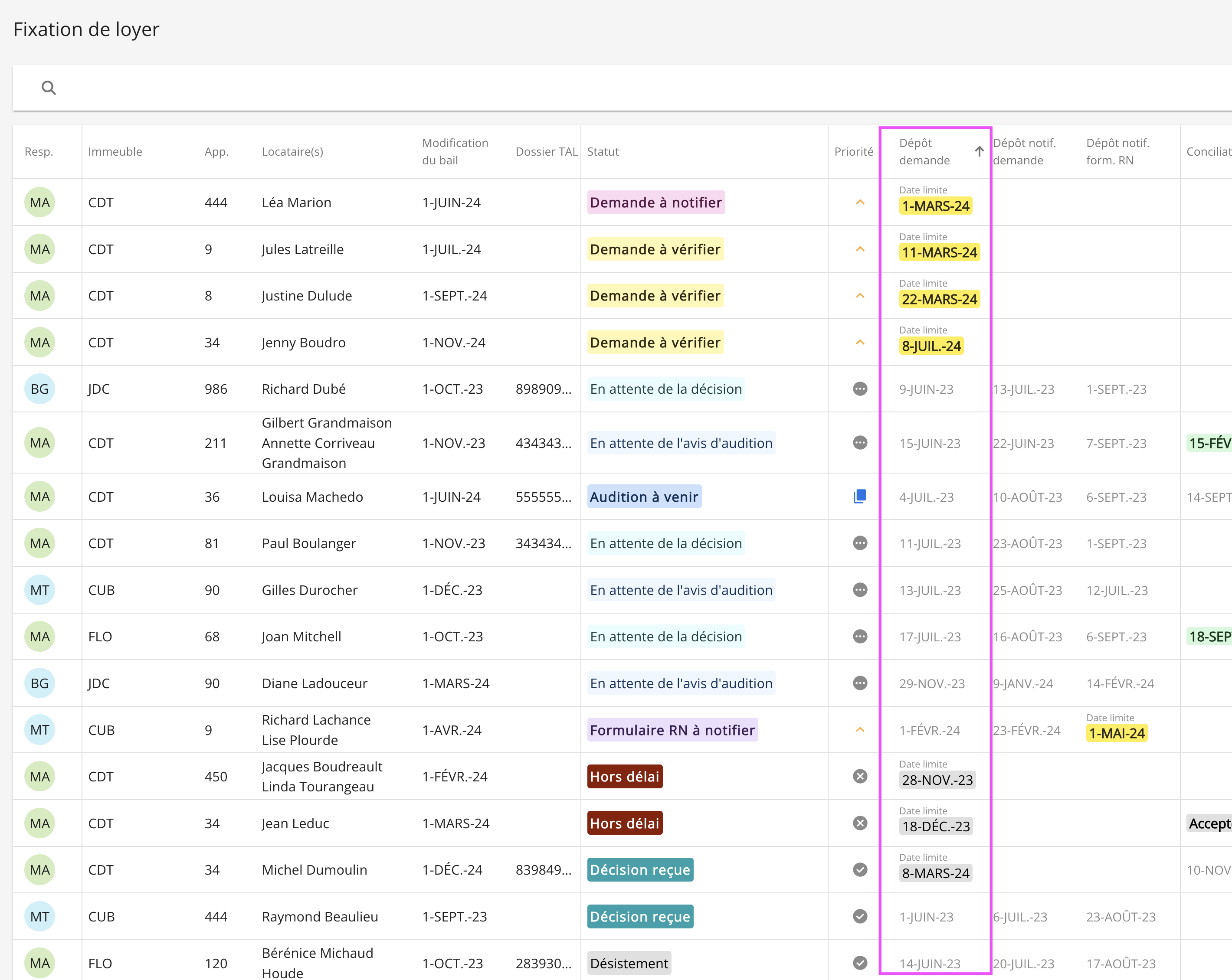 Autant dans le tableau de fixation de loyer que dans celui des autres types de litiges, lorsqu’un tri est appliqué à une colonne qui comprend des dates limites (Dépôt demande, Dépôt notif. demande, Dépôt notif. form. RN), le tri est désormais effectué par priorité.