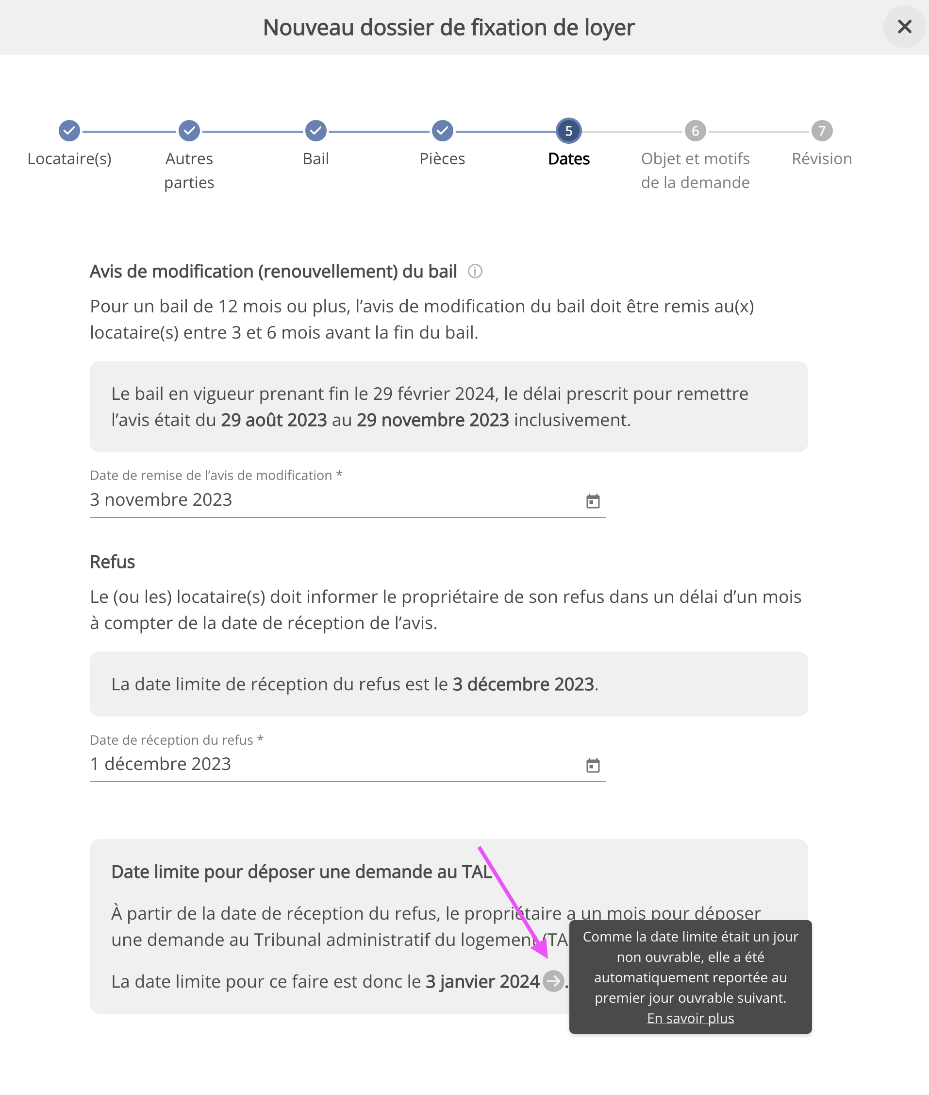 Pour les trois étapes ci-haut, lorsque l'échéance d’un délai tombe un jour non ouvrable (samedi, dimanche ou jour férié), la date limite est automatiquement reportée au premier jour ouvrable suivant. La nouveauté est qu’un indicateur est désormais affiché à droite de la date dans une telle situation, et qu’un lien vers la documentation est inclus dans son infobulle.