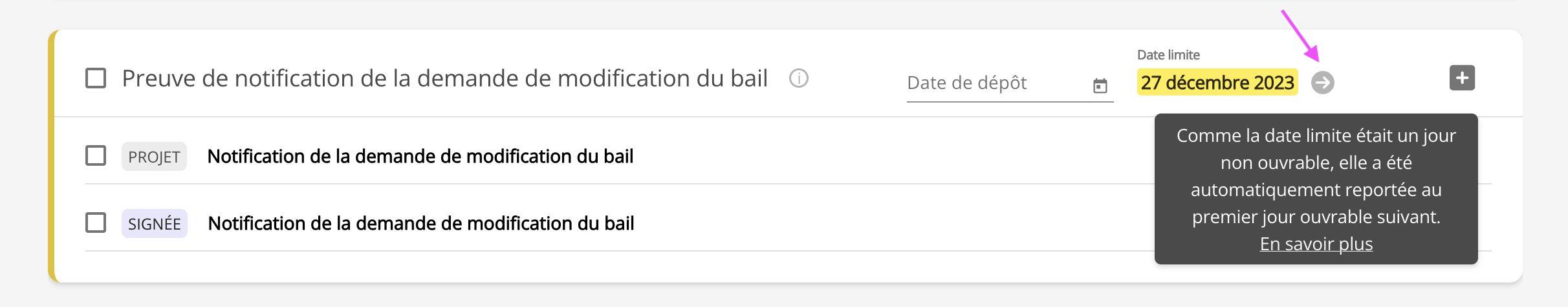 Un indicateur est affiché lorsqu’une date limite est un jour non ouvrable et qu’elle est reportée au jour ouvrable suivant